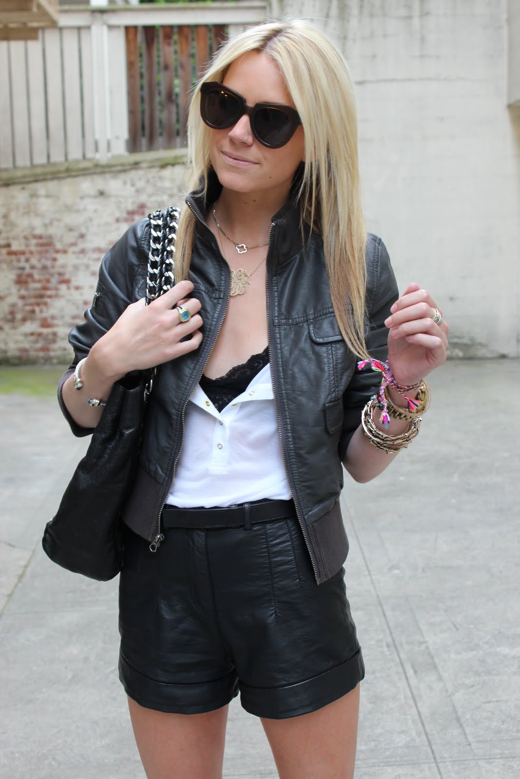 Top: Patterson J. Kincaid. Jacket: Old Navy. Shorts: Forever 21. Shoes: Zara. Bag: Chanel. Belt: Robert Rodriguez. Sunglasses: Karen Walker. Jewelry: David Yumran, Pomellato, Michael Kors, GAP, BR, Reliquary, Max&Chloe.